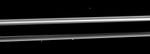 Three of Saturn's small moons straddle the rings in this image. From left to right are Pandora, Prometheus and, near the top right, Epimetheus.