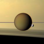 This view looks toward the sides of Titan (3,200 miles or 5,150 kilometers across) and Dione (698 miles or 1,123 kilometers across) facing away from Saturn. North is up on the moons. This view looks toward the northern, sunlit side of the rings from just above the ring plane.
