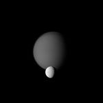 The image was taken in visible green light with the Cassini spacecraft narrow-angle camera on Oct. 18, 2010. The view was obtained at a distance of approximately 2.5 million kilometers (1.6 million miles) from Titan and at a Sun-Titan-spacecraft, or phase, angle of 55 degrees. The view was obtained at a distance of approximately 1.5 million kilometers (930,000 miles) from Tethys and at a Sun-Tethys-spacecraft, or phase, angle of 55 degrees. Image scale is 15 kilometers (9 miles) per pixel on Titan and 9 kilometers (6 miles) per pixel on Tethys.