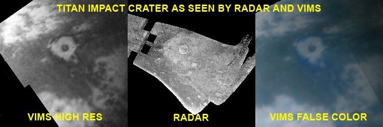 This three-panel image shows one of Titan's most prominent impact craters in an infrared-wavelength image (left), radar image (center) and in the false-color image (right). The Cassini radar imaged this crater during Cassini's third flyby of Titan, on Feb. 15, 2005, (see PIA07368). The crater, located at 16 degrees west, 11 degrees north, is about 80 kilometers (50 miles) in diameter and is surrounded beyond that by a blanket of material thrown out of the crater during impact. In radar, brighter surfaces mean rougher terrains, or else terrains tilted toward the radar.