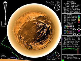 - (Lower left corner) Huygens' trajectory views from the south, a scale bar for comparison to the height of Mount Everest, colored arrows that point to the sun and to the Cassini orbiter.