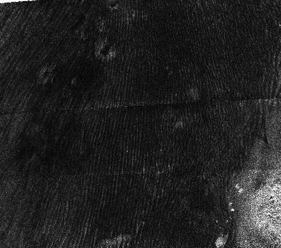 Taken by Cassini's radar mapper on Jan. 13, 2007, during a flyby of Titan, three kinds of terrain can be seen. Throughout the image, the fine striping has been identified as dunes, possibly made from organic material and formed by wind activity. Dunes are a common landform on Titan (see PIA09111 and PIA08738). The bright material at the lower right of the image is interpreted as being topographically higher than the dunes that go around it, and several circular features seen at the top center may be craters that are slowly being buried by the dunes. Since the dunes seem to lie over the craters, the dune activity probably occurred later in time.