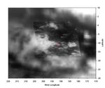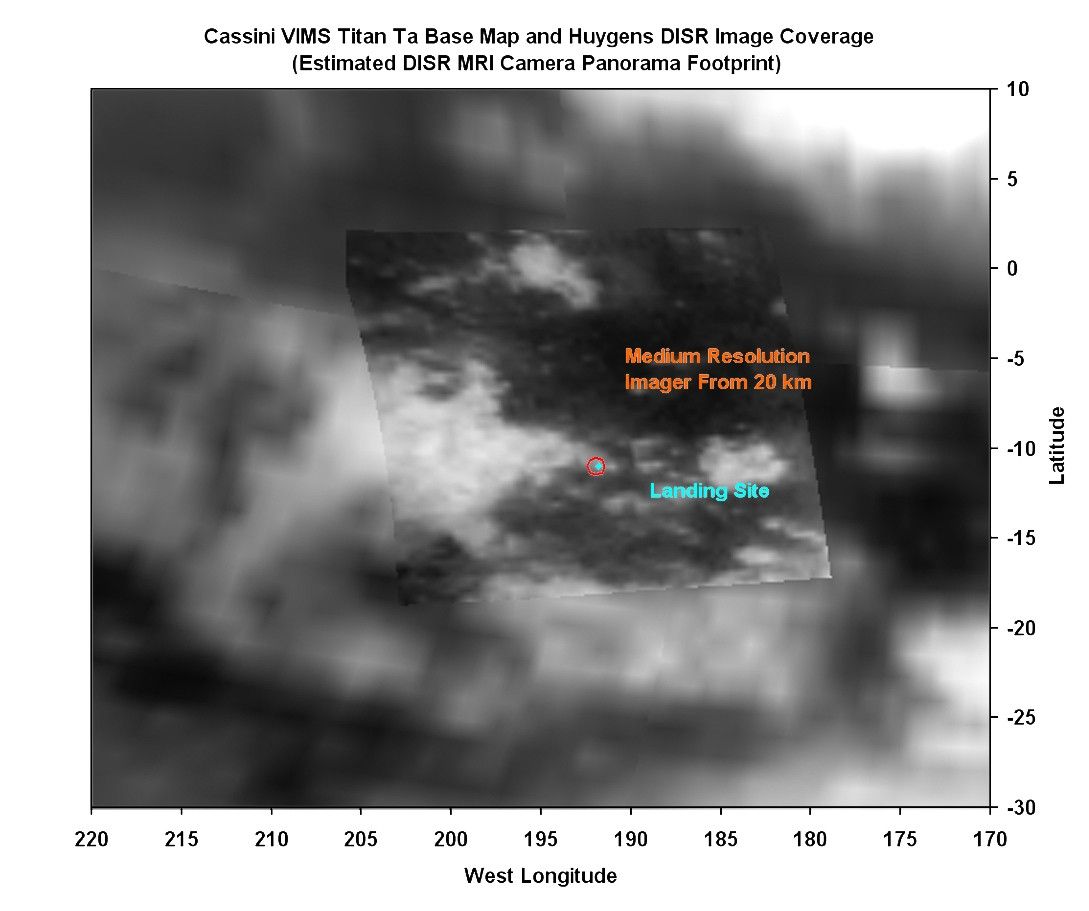 A view of Titan from the visual and infrared mapping spectrometer instrument on the Cassini orbiter. The Huygens probe landed in the small red circle on the boundary of the bright and dark regions. The size of the circle shows the field of view of the Huygens Descent Imager/Spectral Radiometer (DISR) instrument from an altitude of 20 kilometers (about 12 miles).