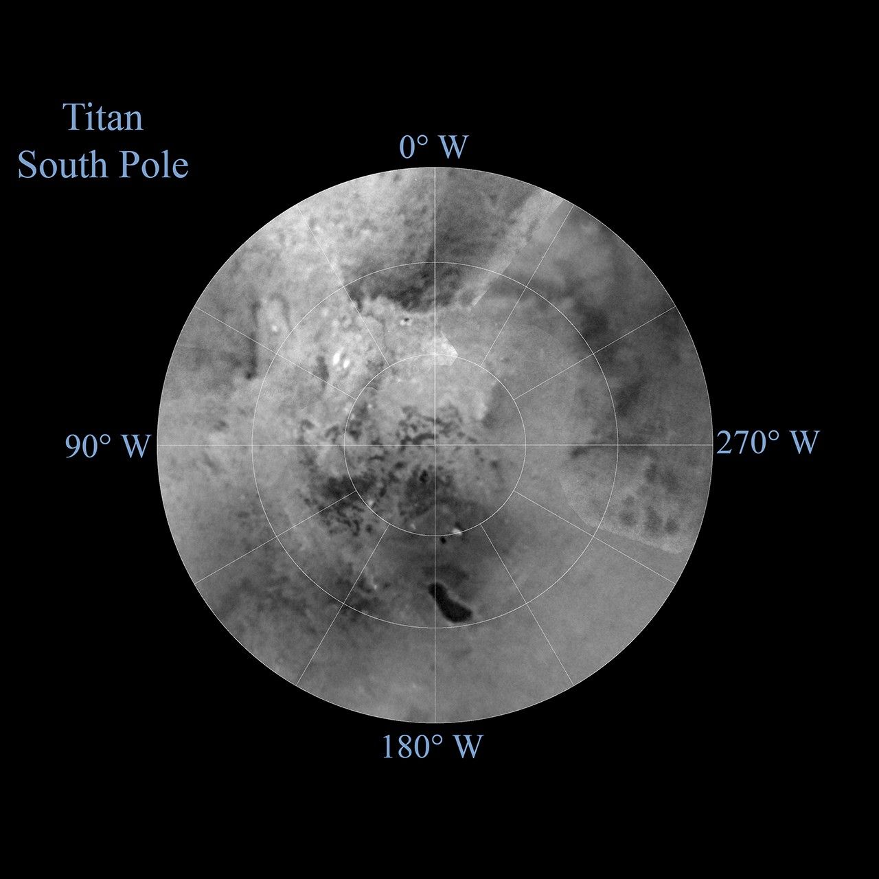 The northern and southern hemispheres of Titan are seen in these polar stereographic maps, assembled in 2015 using the best-available images of the giant Saturnian moon from NASA's Cassini mission. The images were taken by Cassini's imaging cameras using a spectral filter centered at 938 nanometers, allowing researchers to examine variations in albedo (or inherent brightness) across the surface of Titan. These maps utilize imaging data collected through Cassini's flyby on April 7, 2014, known as "T100."