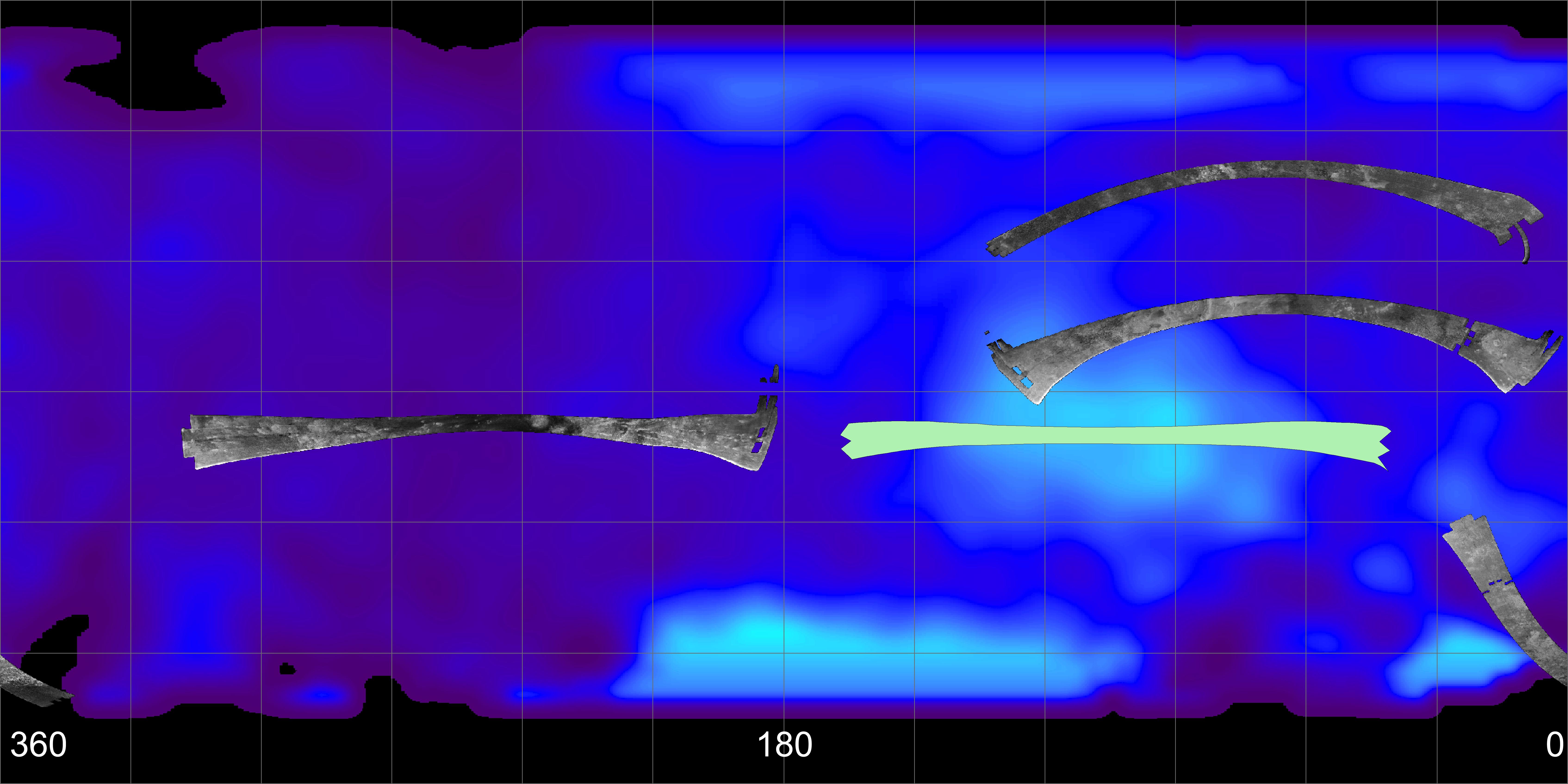 Longitudes are labeled at the bottom of the map. The radar swaths are superimposed on a false-color image made from observations by NASA's Hubble Space Telescope.
