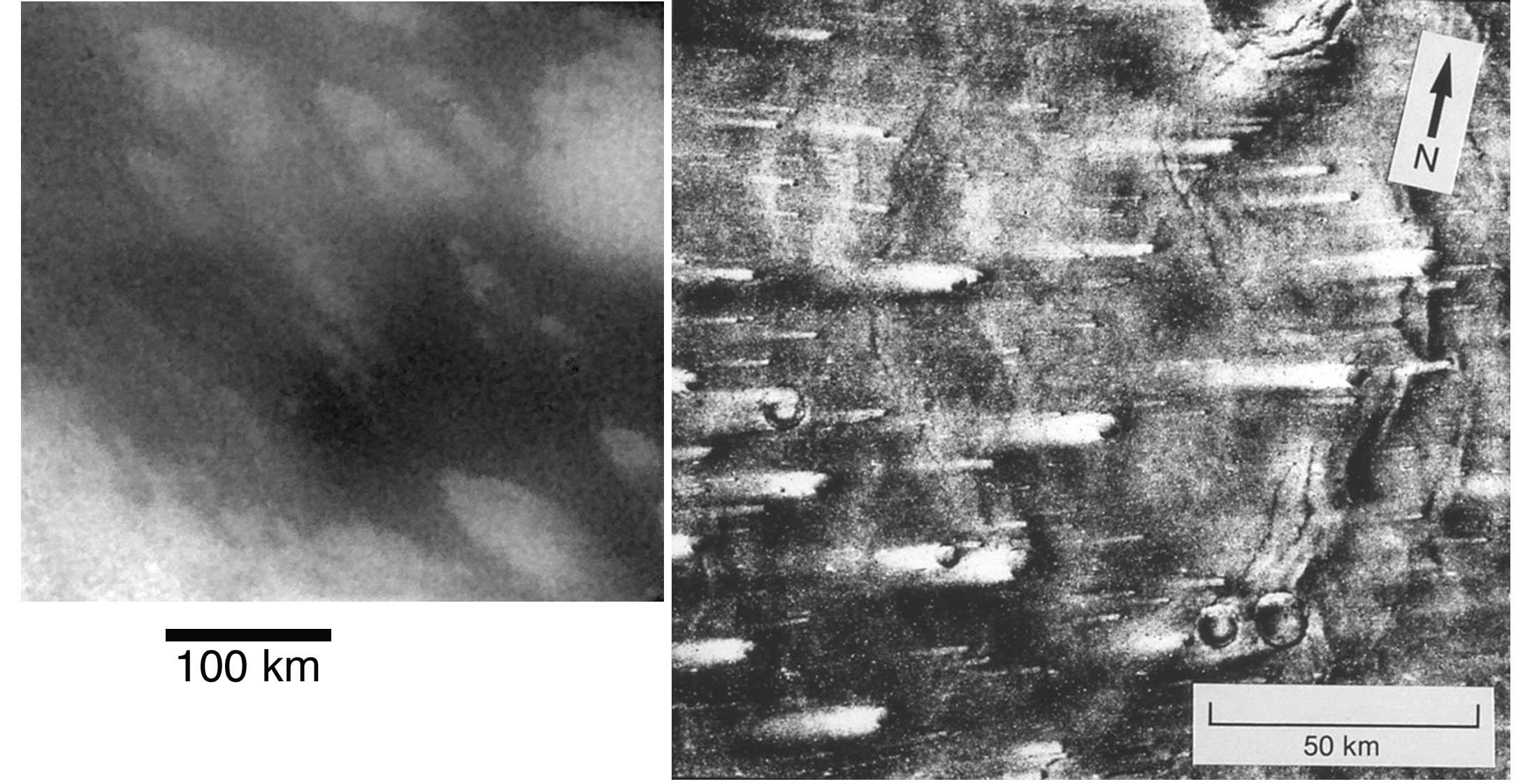 This image compares streaked terrain on Titan and Mars. At left is an image from Cassini of the region where the Huygens probe is expected to land. At right is a picture from NASA's Viking 1 orbiter, showing streaks on Mars caused by winds blowing from right to left. The streaks at the Huygens landing site were formed by some kind of fluid, possibly wind, moving from the upper left to lower right (west to east).