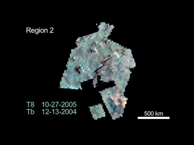 Change is detected on Saturn's moon Titan, in these three composite images from data taken during flybys in October 2005, January 2006 and March 2006 by NASA's Cassini spacecraft.