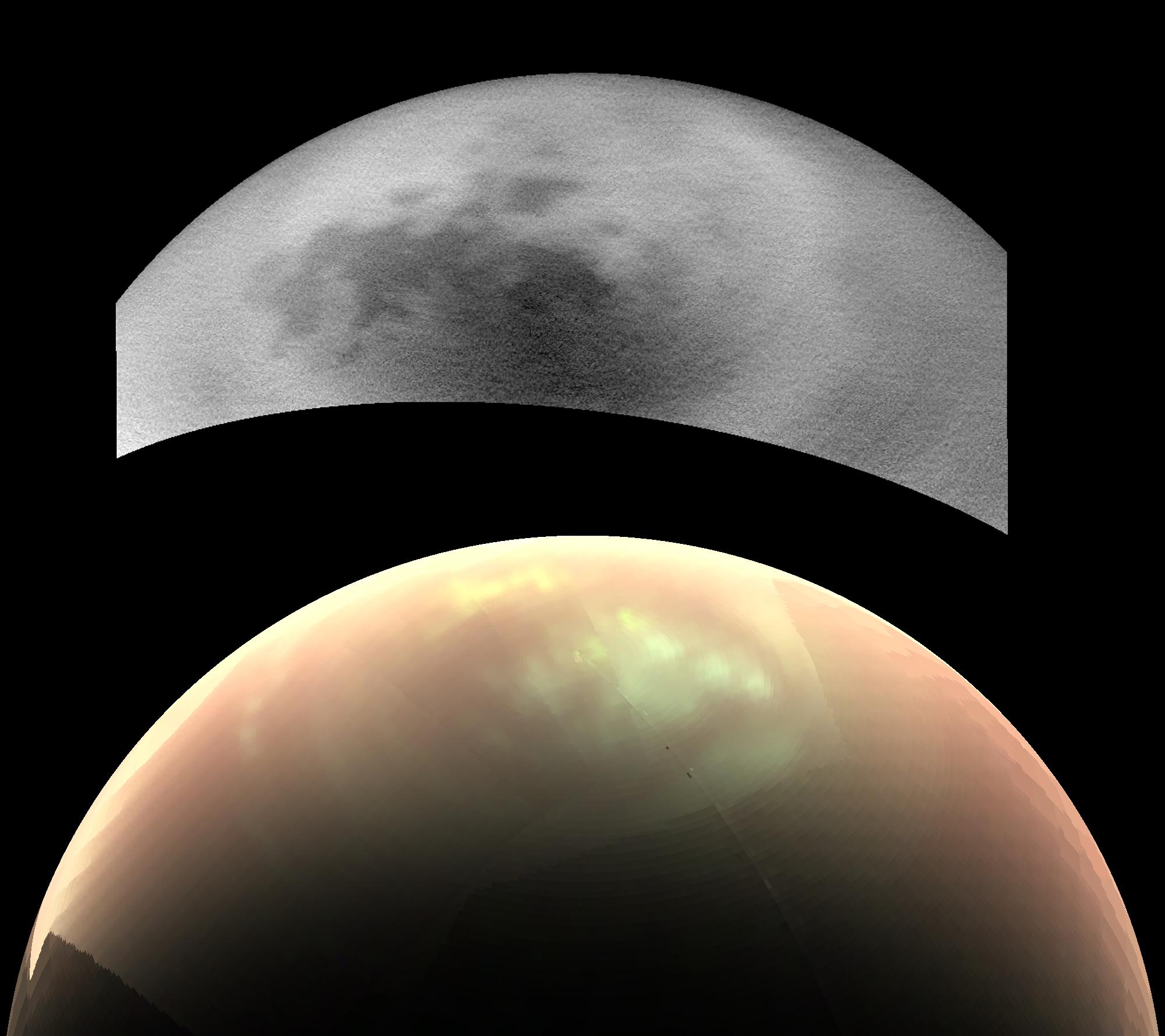 In the top view, a near-infrared image from Cassini's imaging cameras, the skies above Saturn's moon Titan look relatively cloud free. But in the bottom view, at longer infrared wavelengths, Cassini sees a large field of bright clouds. Even though these views were taken at different wavelengths, researchers would expect at least a hint of the clouds to show up in the upper image. Thus they have been trying to understand what's behind the difference.