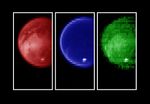 Using near-infrared colors--some three times deeper in the red visible to the human eye--these images reveal the surface with unusual clarity. The left image shows a variety of surface features at a wavelength of 2.0 microns. The darker areas are possibly regions of relatively pure water ice, while the brighter regions likely have a much higher amount of non-ice materials such as simple hydrocarbons. The middle image measured at a wavelength of 2.8 microns shows a very dark surface almost everywhere, as expected for a surface of water ice and simple hydrocarbons. The image on the right, taken at 5.0 microns, is similar to the left image, indicating dark icy regions and brighter hydrocarbon-rich materials. A bright cloud of methane particles is apparent in all three images near the south pole. It's persistence over an extensive range of colors indicates that these cloud particles are large compared to the typical haze particles surrounding the planet, suggesting a dynamically active atmosphere near the South Pole. Color was used to enhance the various wavelengths.