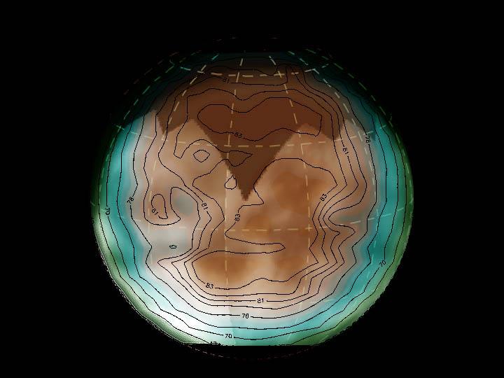 This image shows Titan data from the passive radiometer mode of Cassini's radar instrument overlaid onto a visible-light image mosaic from the spacecraft's imaging science subsystem. The contours and colors show Titan's radiation at microwave wavelengths (about two centimeters or 0.79 inch), while the light and dark shading is from the optical image. This microwave radiation comes directly from Titan itself, rather than being a reflection from the Sun as detected in visible-light images.