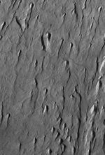 This Mars Global Surveyor (MGS) Mars Orbiter Camera (MOC) image shows yardangs formed by wind erosion of materials exposed on the floor of western Tithonium Chasma. The winds responsible for these landforms blew from the north/northeast (top/upper right). Tithonium Chasma is part of the Valles Marineris system.
