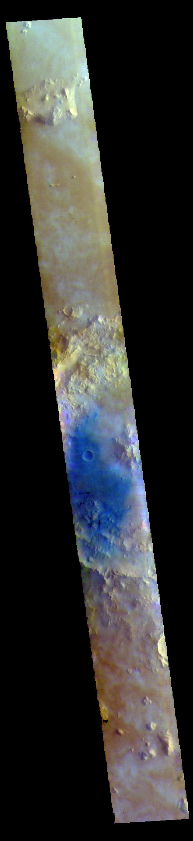 The THEMIS VIS camera contains 5 filters. The data from different filters can be combined in multiple ways to create a false color image. These false color images may reveal subtle variations of the surface not easily identified in a single band image.