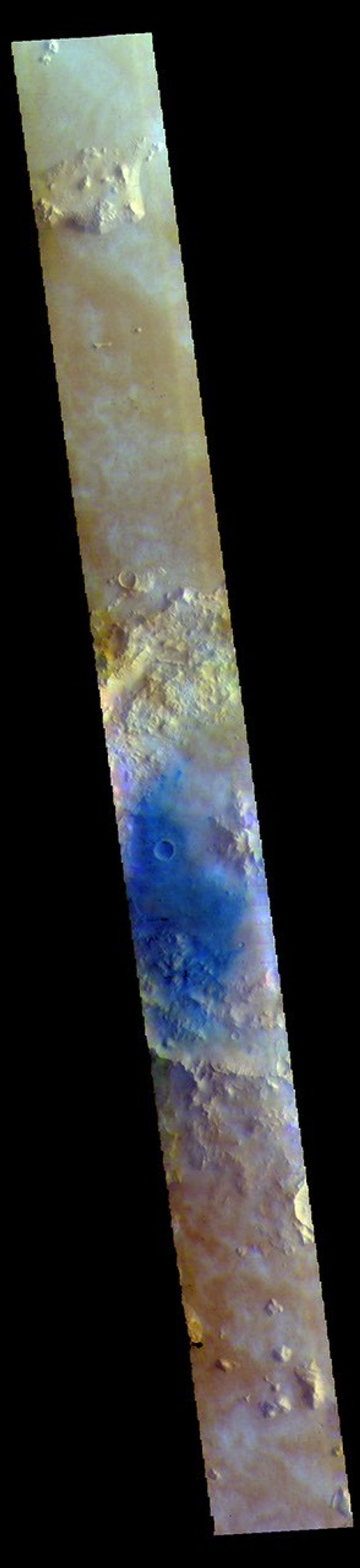 This image from NASA's Mars Odyssey shows Tombaugh Crater. Dark blue tones are basaltic sands of the floor of the crater.