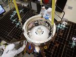This photo shows the upper side of the cruise stage of NASA's InSight spacecraft as specialists at Lockheed Martin Space Systems, Denver, attach it to the spacecraft's back shell. The photo was taken on April 29, 2015.