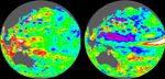 In December (left image), red and white areas indicate the presence of warm, higher than average sea level around Indonesia. At this time, massive amounts of warm water were detected around Indonesia by the TOPEX/Poseidon satellite. The warm, wet air from this water fed the normally heavy rainfall in this region.