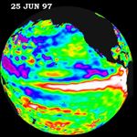 This image of the Pacific Ocean was produced using sea surface height measurements taken by the U.S./French TOPEX/POSEIDON satellite. The image shows sea surface height relative to normal ocean conditions on June 25, 1997 and provides more convincing information that the weather-disrupting phenomenon known as El Niño is back and getting stronger. The white and red areas indicate unusual patterns of heat storage; in the white areas, the sea surface is between 14 and 32 centimeters (6 to 13 inches) above normal; in the red areas, it s about 10 centimeters (4 inches) above normal. The surface area covered by the warm water mass is about one and one-half times the size of the continental United States. The added amount of oceanic warm water near the Americas, with a temperature between 21-30 degrees Celsius (70-85 degrees Fahrenheit), is about 30 times the volume of water in all the U.S. Great Lakes combined. The green areas indicate normal conditions, while purple (the western Pacific) means at least 18 centimeters (7 inches) below normal sea level.