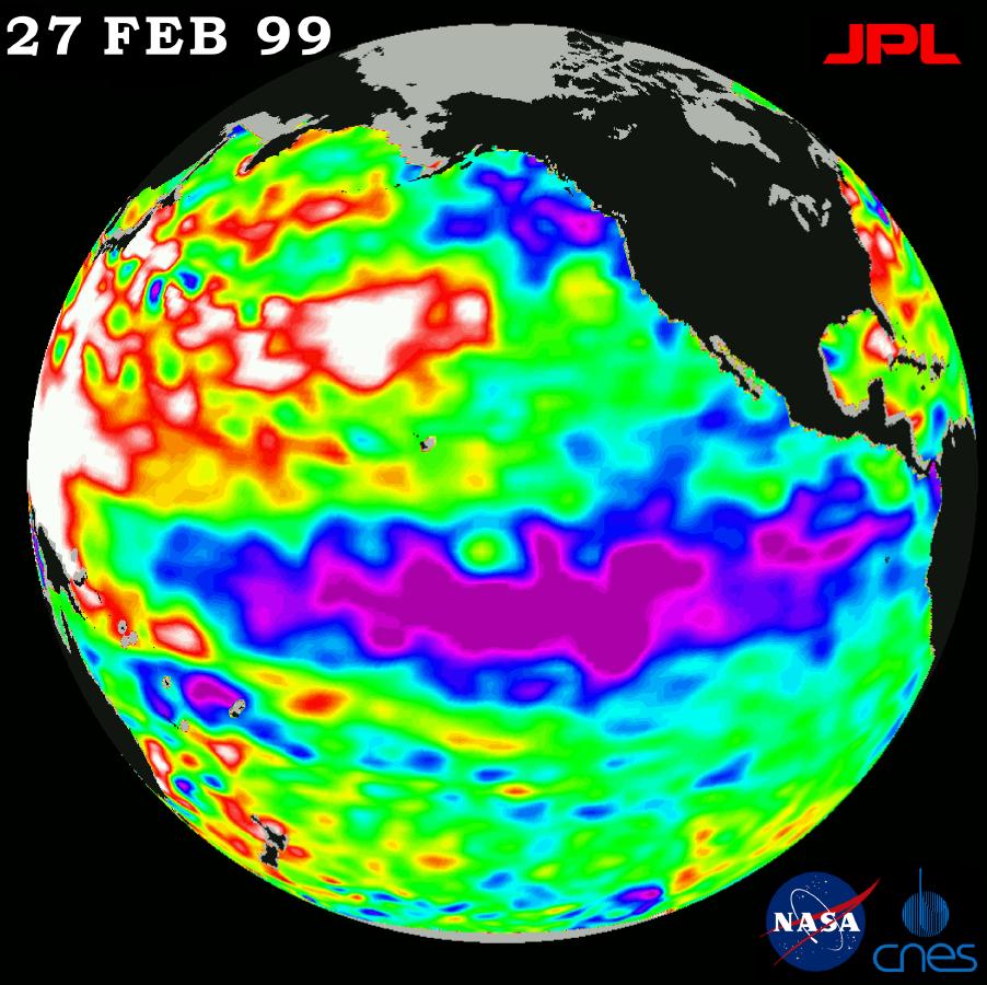 The cold pool of water in the Pacific known as "La Niña" still persists, although it is slowly weakening, according to scientists studying new data from the U.S.-French TOPEX/Poseidon satellite. A new image, produced using sea-surface height measurements taken by the satellite, is available on the Internet at http://www.jpl.nasa.gov/elnino/. It shows sea-surface height on February 27, 1999 relative to normal ocean conditions, reflecting the heat content of the ocean.