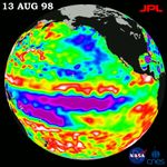 This image of the Pacific Ocean was produced using sea-surface height measurements taken by the U.S.-French TOPEX/Poseidon satellite. The image shows sea surface height relative to normal ocean conditions on August 13, 1998; sea surface height is an indicator of the heat content of the ocean. The purple area in the center of the image is a pool of cold water that the satellite measures as a region of lower than normal sea level. This image shows that the rapid cooling of the central tropical Pacific has stalled and this area of low sea level has stayed in about the same place for the last two months. The purple areas are about 18 centimeters (7 inches) below normal, creating a deficit in the heat supply to the surface waters. It is not certain yet, if this current cooling trend (shown in purple) will eventually evolve into a long-lasting La Niña situation. Remnants of the El Niño warm water pool, shown here in red and white, are still lingering to the north and south of the equator. The effects of El Niño can remain in the climate system for a long time and could still impact weather conditions around the world. The satellite's sea-surface height measurements have provided scientists with a detailed view of the 1997-98 El Niño because the TOPEX/Poseidon satellite measures the changing sea-surface height with unprecedented precision. In this image, the white areas show the sea surface is between 14 and 32 centimeters (6 to 13 inches) above normal; in the red areas, it's about 10 centimeters (4 inches) above normal. The green areas indicate normal conditions. The purple areas are 14 to 18 centimeters (6 to 7 inches) below normal and the blue areas are 5 to 13 centimeters (2 to 5 inches) below normal. The El Niño phenomenon is thought to be triggered when the steady westward blowing trade winds weaken and even reverse direction. This change in the winds allows a large mass of warm water (the red and white area) that is normally located near Australia to move eastward along the equator until it reaches the coast of South America. The displacement of so much warm water affects evaporation, where rain clouds form and, consequently, alters the typical atmospheric jet stream patterns around the world. A La Niña situation is essentially the opposite of an El Niño condition, where the trade winds are stronger than normal and the cold water that normally exists along the coast of South America extends to the central equatorial Pacific. A La Niña situation also changes global weather patterns, and is associated with less moisture in the air resulting in less rain along the coasts of North and South America. TOPEX/ Poseidon will be able to track a potentially developing La Niña with the same accuracy.