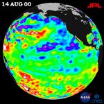 Looking at the entire Pacific basin, the Pacific Decadal Oscillation's (PDO) characteristic warm horseshoe and cool wedge pattern is still evident in this sea-level height image. The PDO is a long-term ocean temperature fluctuation of the Pacific Ocean that waxes and wanes approximately every 10 to 20 years. Most recent National Oceanic and Atmospheric Administration (NOAA) sea-surface temperature date also clearly illustrate the persistence of this basin-wide pattern. They are available at: http://psbsgi1.nesdis.noaa.gov:8080/PSB/EPS/SST/climo.html.