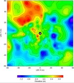 Topographic map of the landing site, to a distance of 60 meters from the lander in the LSC coordinate system. The lander is shown schematically in the center; 2.5 meter radius circle (black) centered on the camera was not mapped. Gentle relief [root mean square (rms) elevation variation 0.5 m; rms a directional slope 40] and organization of topography into northwest and northeast-trending ridges about 20 meters apart are apparent. Roughly 30% of the illustrated area is hidden from the camera behind these ridges. Contours (0.2 m interval) and color coding of elevations were generated from a digital terrain model, which was interpolated by kriging from approximately 700 measured points. Angular and parallax point coordinates were measured manually on a large (5 m length) anaglyphic uncontrolled mosaic and used to calculate Cartesian (LSC) coordinates. Errors in azimuth on the order of 10 are therefore likely; elevation errors were minimized by referencing elevations to the local horizon. The uncertainty in range measurements increases quadratically with range. Given a measurement error of 1/2 pixel, the expected precision in range is ~ 0.3 meter at 10 meter range, and ~ 10 meters at 60 meter range. Repeated measurements were made, compared, and edited for consistency to improve the range precision. Systematic errors undoubtedly remain and will be corrected in future maps compiled digitally from geometrically controlled images. Cartographic processing by U.S. Geological Survey.