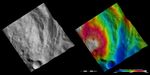 These Dawn FC (framing camera) images show part of Rheasilvia quadrangle in Vesta's southern hemisphere. The left image is an albedo image, which is taken directly through the clear filter of the FC. Such an image shows the albedo (eg. brightness/ darkness) of the surface. The right image uses the same albedo image as its base but then a color-coded height representation of the topography is overlain onto it. The topography is calculated from a set of images that were observed from different viewing directions, allowing stereo reconstruction. The various colors correspond to the height of the area. The white and red areas in the left of the image are the highest areas and the blue area in the right of the image is the lowest area. The area denoted by the roughly circular white and red areas is the central complex feature of Vesta's Rheasilvia basin. The high relief of the central complex is much clearer in the topography image than in the albedo image. Also clear in the topography image is the hummocky terrain, which surrounds the central complex feature. This is an undulating terrain, which consists of ridges and grooves. The height differences between the ridges and grooves are clear in the topography image: the grooves are low and colored blue and the ridges are high and colored green, yellow and red.