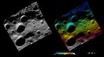 These Dawn FC (framing camera) images show the 12km diameter Floronia crater, after which Floronia quadrangle is named. Floronia crater is the middle crater in the vertical column of 3 craters, which are slightly offset from the center of the image. The left image is an albedo image, which is taken directly through the clear filter of the FC. Such an image shows the albedo (e.g. brightness/darkness) of the surface. The right image uses the same albedo image as its base but then a color-coded height representation of the topography is overlain onto it. The topography is calculated from a set of images that were observed from different viewing directions, allowing stereo reconstruction. The various colors correspond to the height of the area. The white and red areas at the bottom of the image are the highest areas and the blue area at the top of the image is the lowest area. The color-coded height image shows Floronia crater to be reasonably deep as it grades from a green color at the rim to a blue color further into its interior.