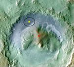 Color coding in this image of Gale Crater on Mars represents differences in elevation. The vertical difference from a low point inside the landing ellipse for NASA's Mars Science Laboratory (yellow dot) to a high point on the mountain inside the crater (red dot) is about 3 miles (5 kilometers).