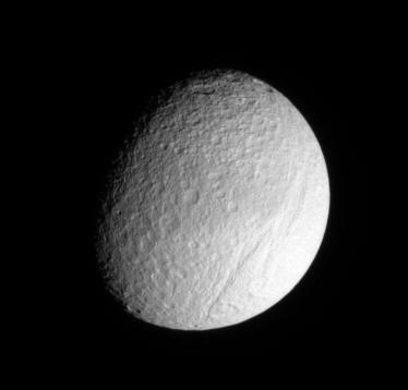 Ithaca Chasma rips across the cratered surface of Tethys, creating a scar more than 1,000 kilometers (600 miles) long, from north to south.