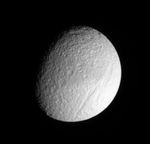 This view shows the Saturn-facing side of Tethys. North is up.