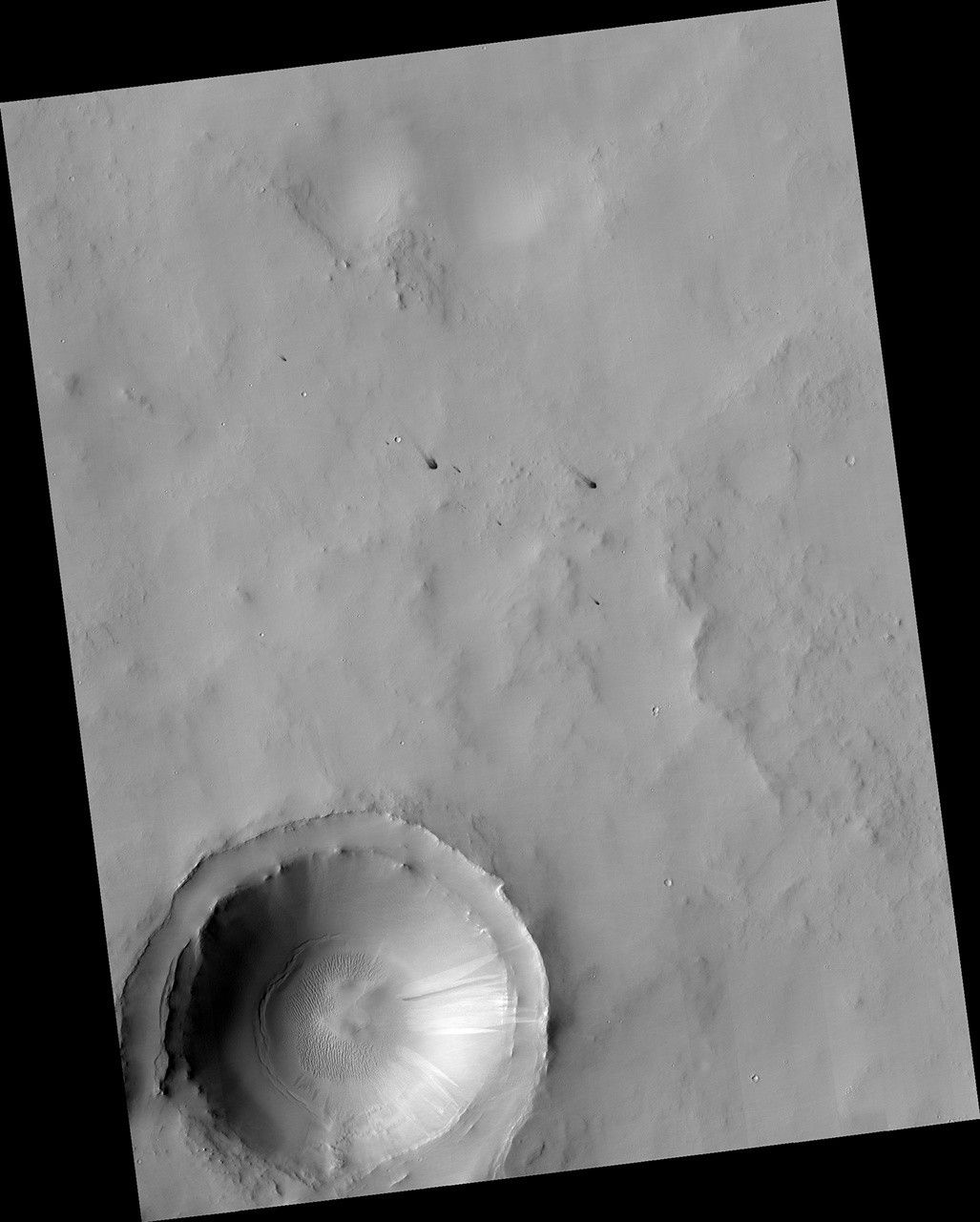 As well as confirming a new impact, this image also showed other features commonly found in dusty areas: slope streaks and bed-forms. A close-up picture of the roughly 2.5-kilometer-diameter crater at the bottom of the main image shows ridges on the crater floor where dust has become trapped, and bright and dark streaks down the crater walls where dust has cascaded down the slope.