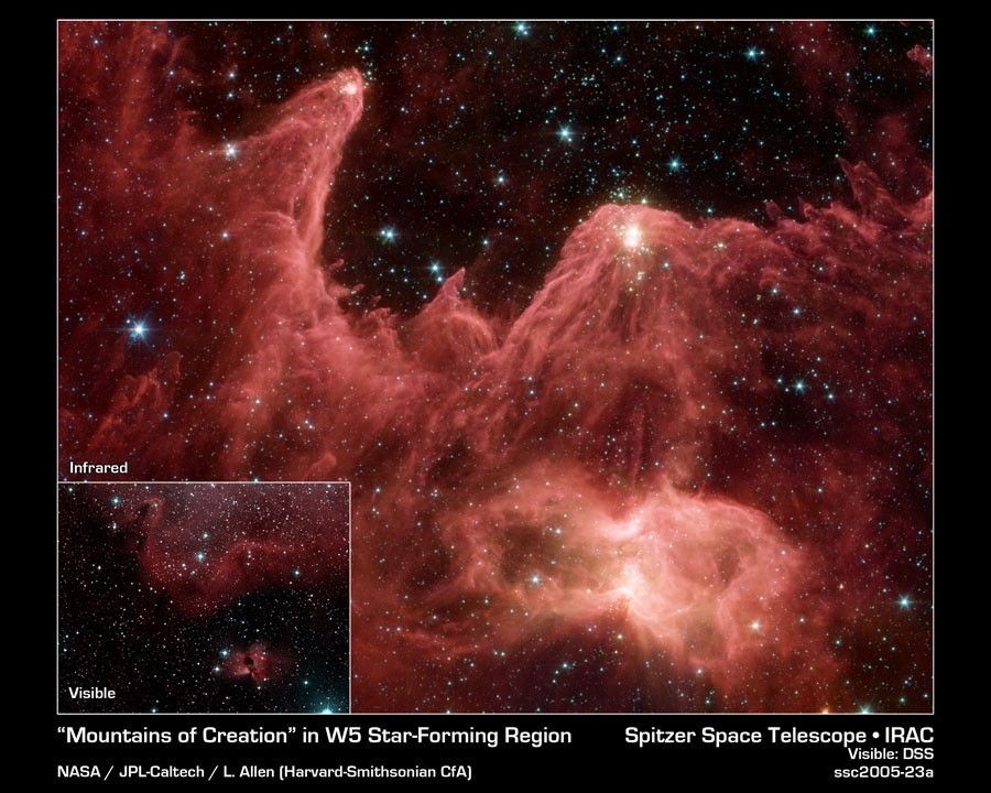 The image composite compares an infrared image taken by NASA's Spitzer Space Telescope to a visible-light picture of the same region. While the infrared view, dubbed "Mountains of Creation," reveals towering pillars of dust aglow with the light of embryonic stars (white/yellow), the visible-light view shows dark, barely-visible pillars. The added detail in the Spitzer image reveals a dynamic region in the process of evolving and creating new stellar life.