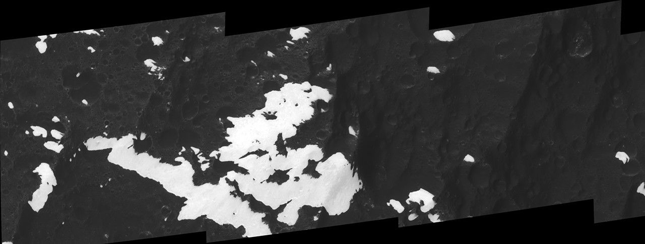 Here, the brightness pattern on the surface is very complex. The mountain in the center of this view is part of the range informally named "the Voyager mountains" that were first detected on the limb of the moon in NASA Voyager spacecraft images. Interestingly, its eastern (right) flank is dark, while the other flanks are bright. This suggests that external material arriving on Iapetus from its orbital motion might play a role in the darkening process. One plausible source, the outer moons of Saturn, might provide a very thin but steady stream of very dark particles from the eastern direction as seen from this mountain.