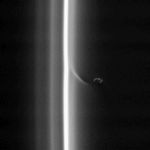This view, like PIA08303, shows Prometheus with a streamer it has created in the inner edge of the F ring. Prometheus comes close to the inner edge of the ring once per orbit, perturbing the ring particles there. In 2009, the moon's orbit is expected to carry it repeatedly into the F ring core, an event that ring scientists are eagerly awaiting.