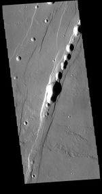 This VIS image shows part of Tractus Catena, just one of many north/south trending tectonic graben located south and east of Alba Mons. The features running vertically in the image are part of Tractus Catena. While other graben in the area are identified as fossae (defined as a long, narrow depression), the circular depressions within this graben lead to the descriptor name catena (defined as a chain of craters). In this case the craters are a result of roof collapse into an underlying open space such as a lava tube.