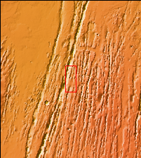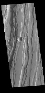 This VIS image shows part of both Tractus Fossae and Tractus Catena, some of many north/south trending tectonic graben located south of Alba Mons. The deeper depression running vertically on the left side of the image is Tractus Catena. While the other grabens to the right side are Tractus Fossae. The term fossae is defined as a long, narrow depressions, whereas the term catena is defined as a chain of craters. The circular depressions within in the Tractus Catena graben lead to the descriptor name catena. However, in this case the craters are a result of roof collapse into an underlying open space such as a lava tube, rather than a set of impact craters.