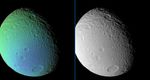 An extreme false-color view of Tethys reveals a surface detail not visible in a monochrome view taken at the same time.
