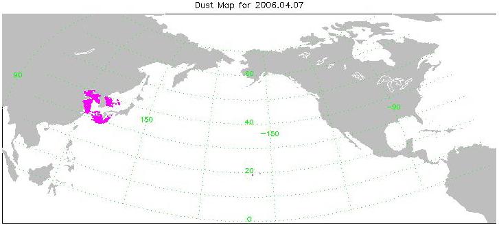 This animation is made from a series of images created with data from the AIRS instrument. The animation spans 10 days beginning on April 7, 2006 and ending on April 16. The magenta color in the images represents where AIRS detects dust in the atmosphere. The images are preliminary as scientists work on verifying the accuracy of the AIRS ability to detect dust, and an effort to cross-compare the AIRS results with what other sensors see is just getting under way. However, the spatial consistency and temporal evolution we see in the AIRS data look plausible, even over land.