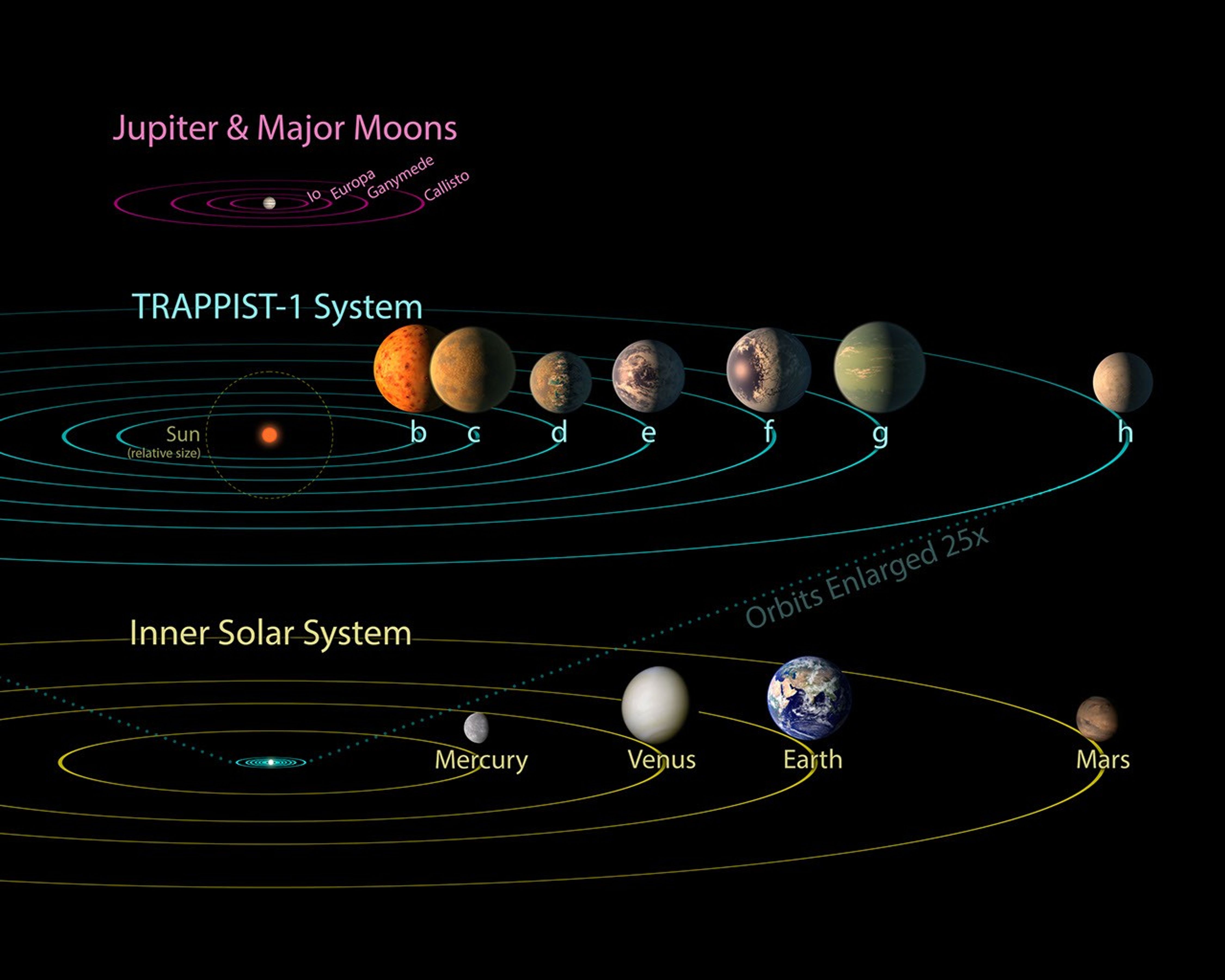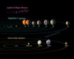 All seven planets discovered in orbit around the red dwarf star TRAPPIST-1 could easily fit inside the orbit of Mercury, the innermost planet of our solar system. In fact, they would have room to spare. TRAPPIST-1 also is only a fraction of the size of our sun; it isn't much larger than Jupiter. So the TRAPPIST-1 system's proportions look more like Jupiter and its moons than those of our solar system.