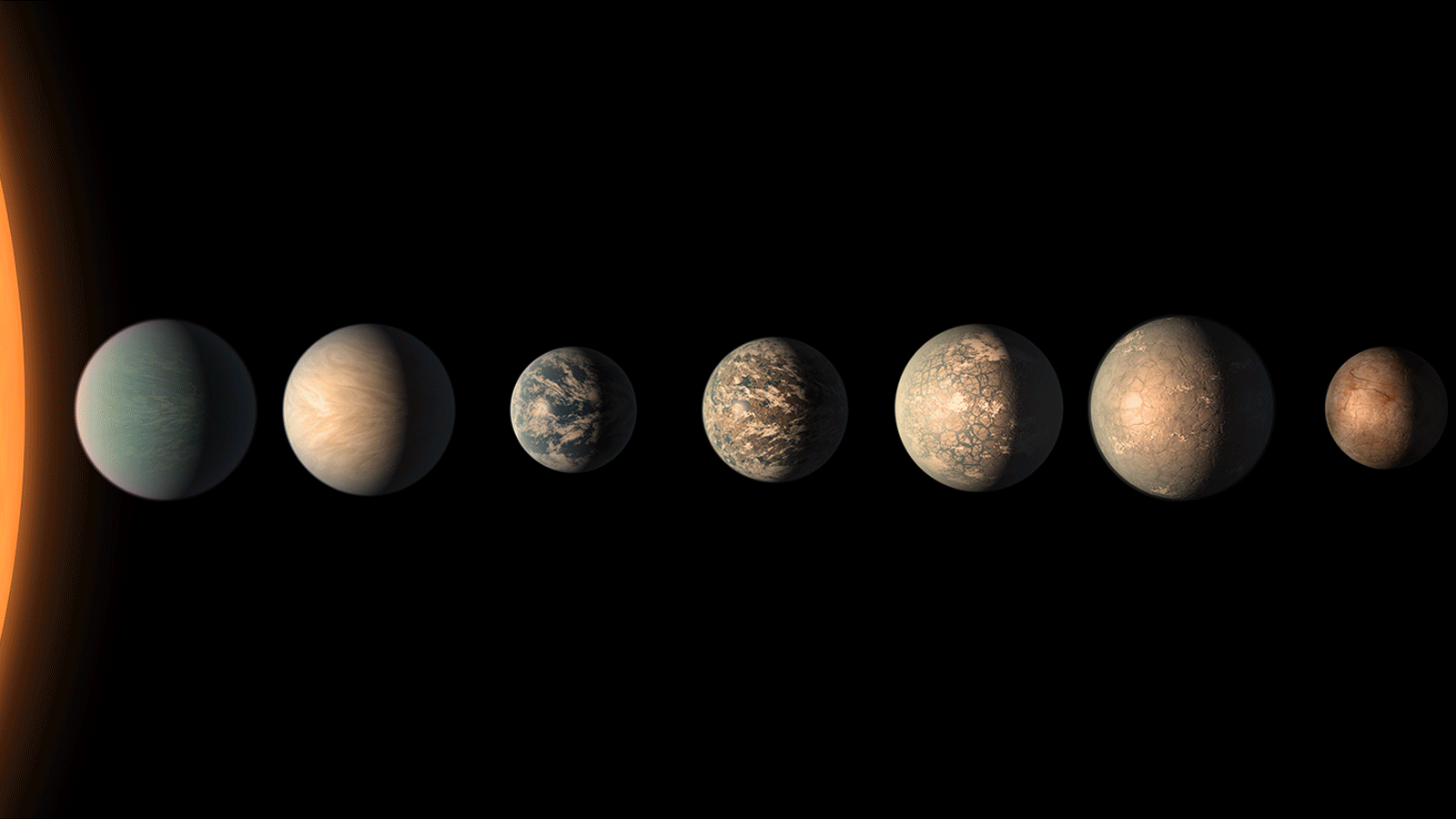 In this illustration, the relative sizes of the planets and their host star, an ultracool dwarf, are all shown to scale.