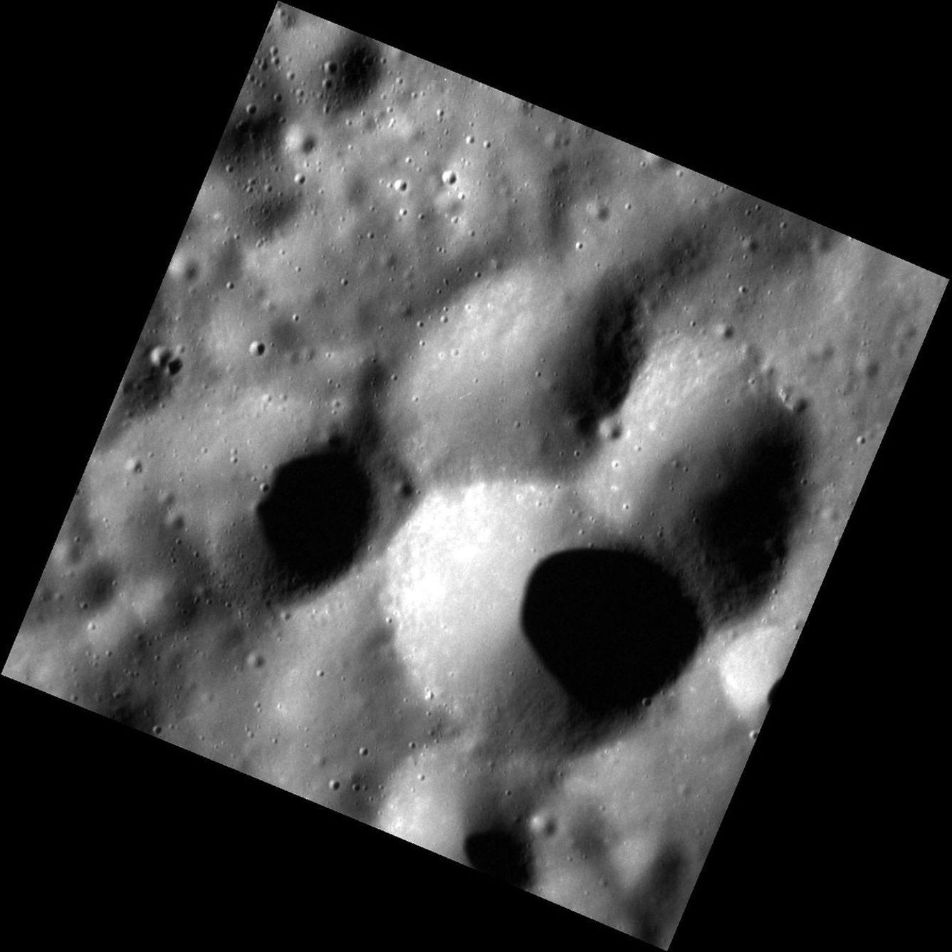 This very high resolution image features three impact craters of nearly the same size that overlap to form a cloverleaf pattern. All three have rounded rims, indicating that they are relatively old. Determining the sequence of events is difficult. It may be that the one at the bottom formed most recently, blasting away sections of the rims of the other two.