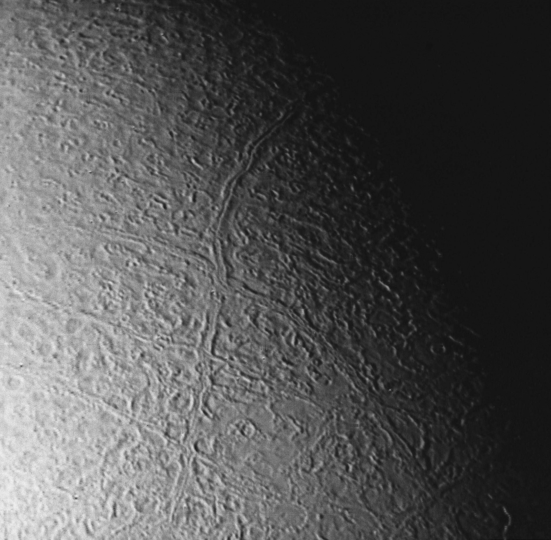 This image of Triton was taken from a distance of about 130,000 kilometers (80,000 miles) at 12:20 a.m. PDT Aug. 25 1989. The image was received at JPL four hours later at about 4:20 a.m. The smallest detail that can be seen is about 2.5 kilometers (1.5 miles) across. The long linear feature extending vertically across the image is probably a graben (a narrow down dropped fault block) about 35 kilometers (20 miles) across. The ridge in the center of the graben probably is ice that has welled up by plastic flow in the floor of the graben. The surrounding terrain is a relatively young icy surface with few impact craters.