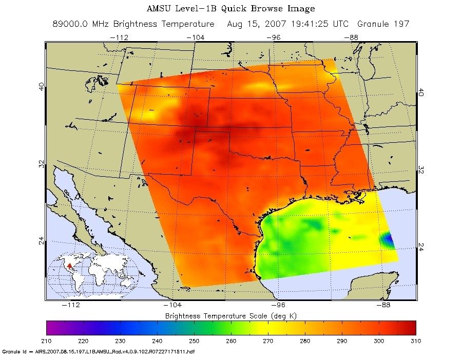 In the AIRS microwave imagery, deep blue areas in storms show where the most precipitation occurs, or where ice crystals are present in the convective cloud tops. Outside of these storm regions, deep blue areas may also occur over the sea surface due to its low radiation emissivity. On the other hand, land appears much warmer due to its high radiation emissivity.