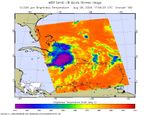 Because infrared radiation does not penetrate through clouds, AIRS infrared images show either the temperature of the cloud tops or the surface of the Earth in cloud-free regions. The lowest temperatures (in purple) are associated with high, cold cloud tops that make up the top of the storm. In cloud-free areas the AIRS instrument will receive the infrared radiation from the surface of the Earth, resulting in the warmest temperatures (orange/red).
