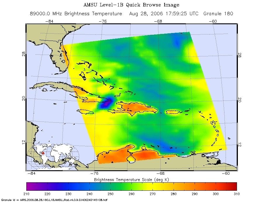 In the AIRS microwave imagery, deep blue areas in storms show where the most precipitation occurs, or where ice crystals are present in the convective cloud tops. Outside of these storm regions, deep blue areas may also occur over the sea surface due to its low radiation emissivity. On the other hand, land appears much warmer due to its high radiation emissivity.