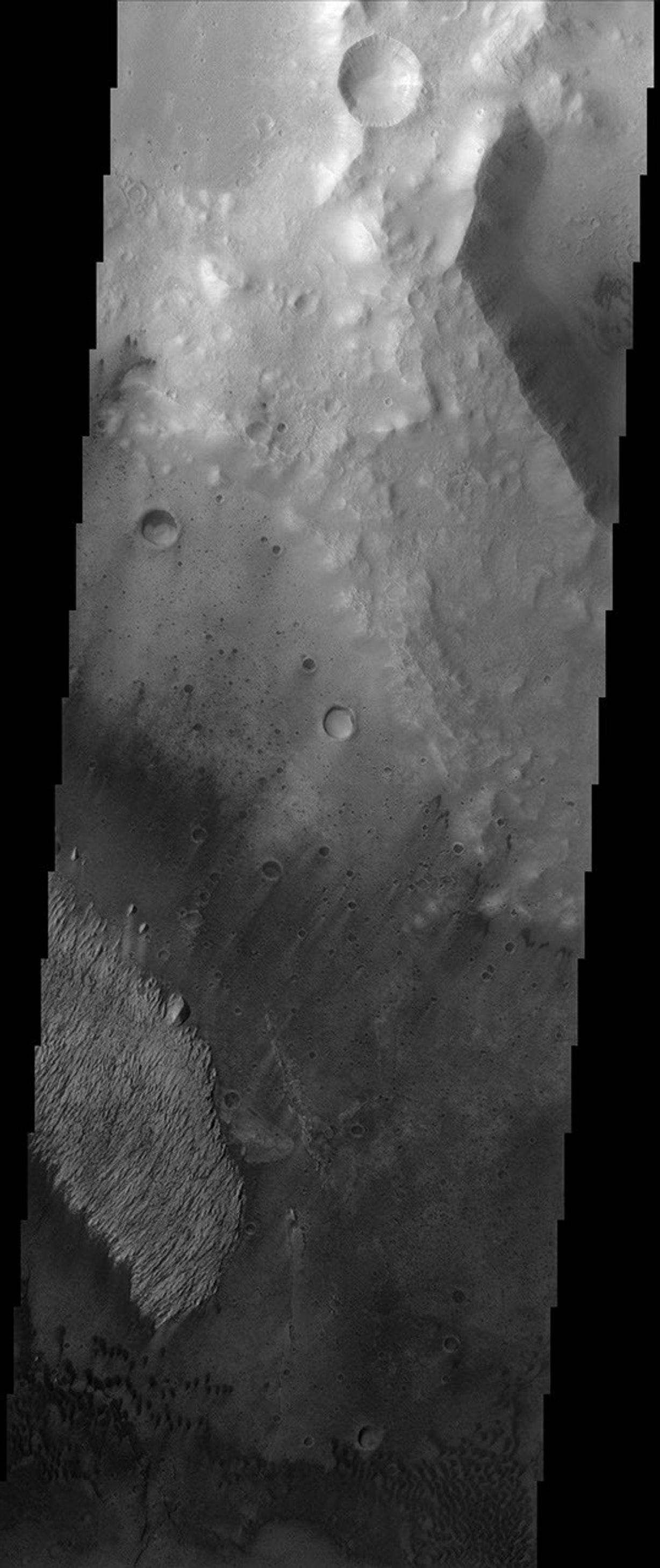 Note: this THEMIS visual image has not been radiometrically nor geometrically calibrated for this preliminary release. An empirical correction has been performed to remove instrumental effects. A linear shift has been applied in the cross-track and down-track direction to approximate spacecraft and planetary motion. Fully calibrated and geometrically projected images will be released through the Planetary Data System in accordance with Project policies at a later time.