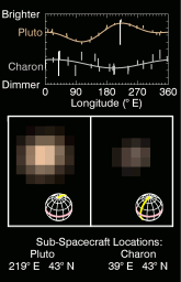 The top panel shows in graphical form how the brightness in MVIC's red channel (540-700 nm) varies with the sub-spacecraft longitude, including data from more distant images dating back to May 1.The moving white vertical lines indicate the observed central longitudes on Pluto and Charon as the images below rotate.These results are consistent with earlier Hubble Space Telescope observations of the lightcurves of Pluto and Charon.Pluto appears dimmest when the dark region on its trailing hemisphere (around 90° E) is oriented toward the observer and brighter when the dark area has rotated off the visible hemisphere and a bright region on the anti-Charon hemisphere is seen.A different, lower amplitude lightcurve variation is seen on Charon, where the Pluto-facing hemisphere (around 0° E) appears brighter than the anti-Pluto hemisphere.