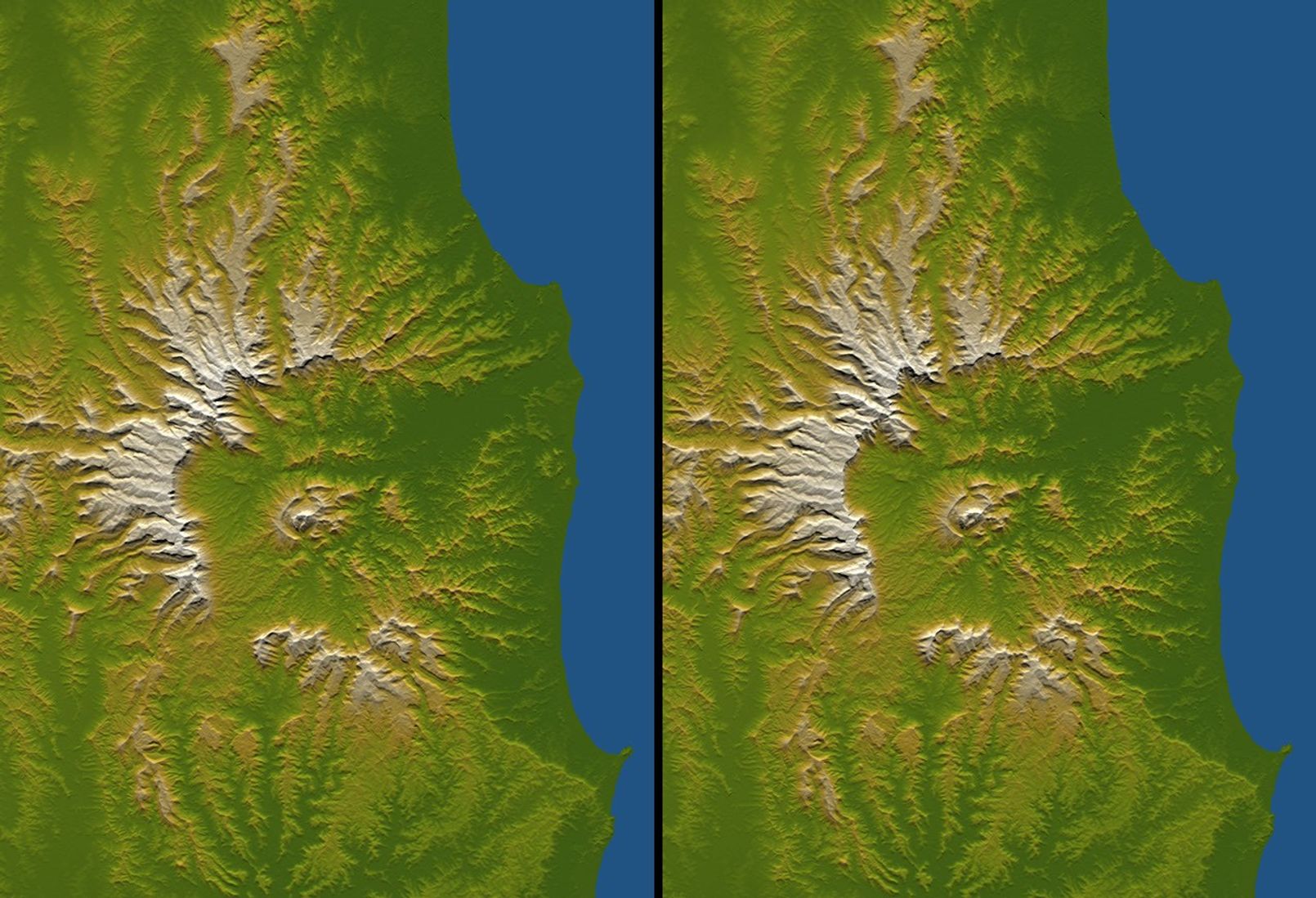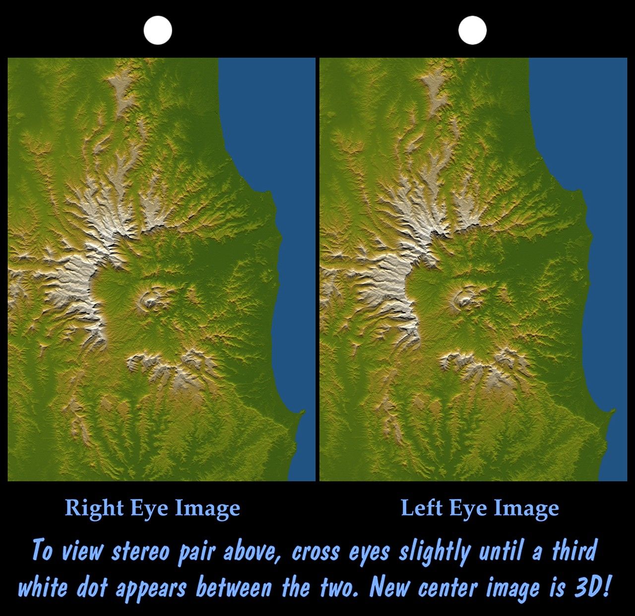 Three visualization methods were combined to produce this image: shading, color coding, and synthetic stereoscopy. The shade image was derived by computing topographic slope in the north-south direction. Northern slopes appear bright and southern slopes appear dark. Color coding is directly related to topographic height, with green at the lower elevations, rising through yellow and tan, to white at the highest elevations. The stereoscopic effect was then created by generating two differing perspectives, one for each eye (see Figure 1). The image can be seen in 3-D by viewing the left image with the right eye and the right image with the left eye (cross-eyed viewing) or by downloading, printing, and splitting the image pair and viewing them with a stereoscope. When stereoscopically merged, the result is a vertically exaggerated view of Earth's surface in its full three dimensions. Elevations range from sea level (shown in blue) to about 1340 meters (4400 feet) along the northwest caldera rim.