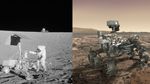 Side-by-side images depict NASA's Surveyor 3 spacecraft (left) and an artist's concept of the Mars 2020 rover (right).