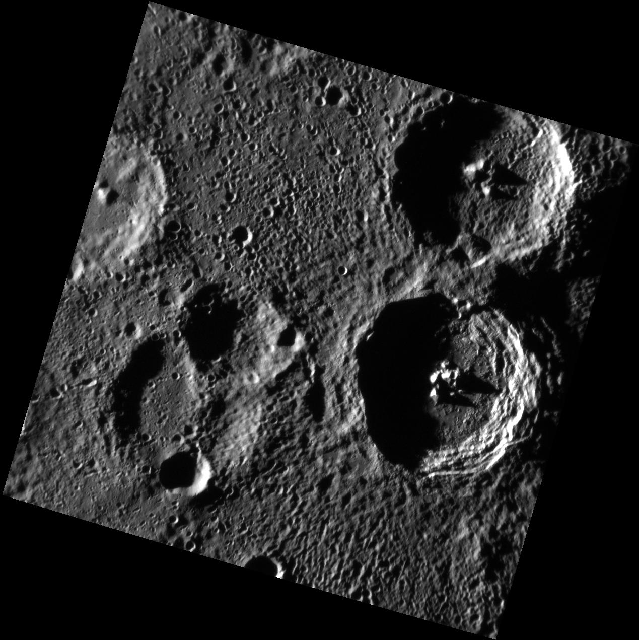 This NAC image features named craters Holberg and Spitteler. The craters are similar in diameters (about 61 km and 62 km respectively) and both have central peaks. The craters are nearly identical in structure but were formed by separate impacts. Holberg's more degraded appearance and higher density of superposed craters indicate that it is older than Spitteler. The slump in Holberg's wall closest to Spitteler may have been created during the Spitteler impact event.