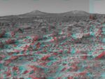 The two hills in the distance, approximately one to two kilometers away, have been dubbed the "Twin Peaks" and are of great interest to Pathfinder scientists as objects of future study. 3D glasses are necessary to identify surface detail. The white areas on the left hill, called the "Ski Run" by scientists, may have been formed by hydrologic processes.